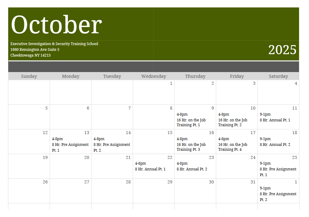 This is a 16-hour course that must be completed within 90 days of employment as a security guard. The course provides the student with detailed information on the duties and responsibilities a security guard. Topics covered in this conduct, incident command system, and terrorism. The passing of an examination is required for successful completion of this course.